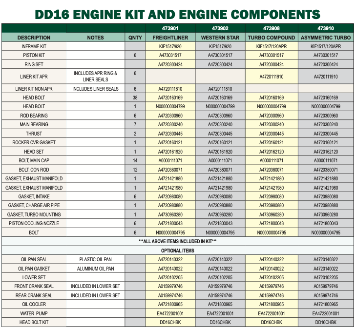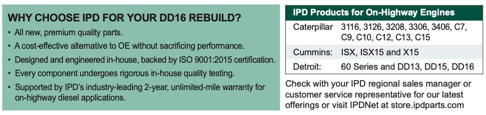 IPD’s newest in-frame kit delivers everything you need to rebuild your DD16 with confidence. Leveraging the same trusted engineering foundation as our DD15 kit, we’ve developed a new, friction-welded steel piston designed specifically for the DD16’s demands—offering the durability and performance you expect from IPD. Whether you’re a fleet manager, engine rebuilder, or owner-operator, you can count on IPD’s precision- engineered components to extend engine life, improve reliability, and protect your investment mile after mile.